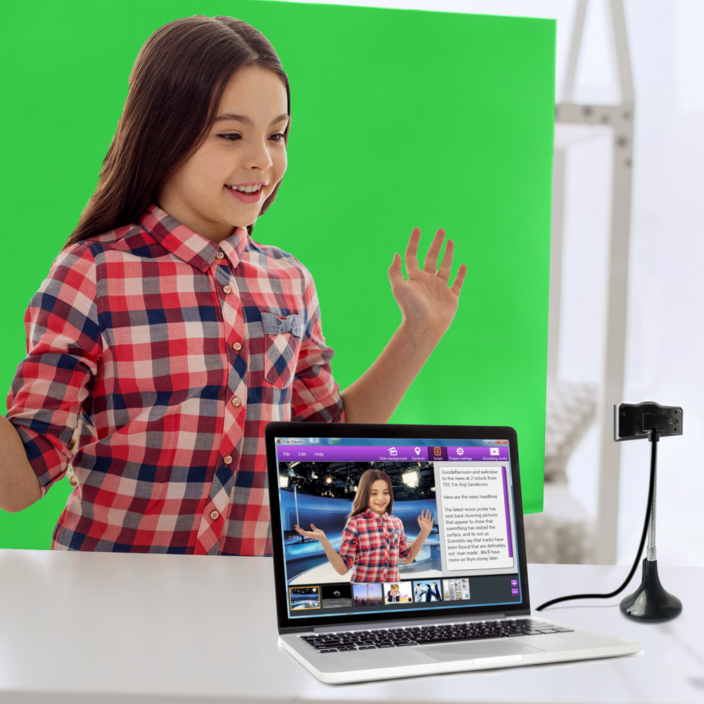 Kit includes: 1 Green Screen 9 ft. x 5 ft. Backdrop Cloth, 1 USB Digital Web Camera (10X digital zoom), I Can Present Editing Software, Instruction booklet