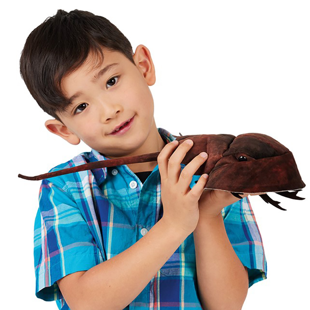 Introducing a true ancient survivor: the Folkmanis® Horseshoe Crab Hand Puppet! This remarkable living fossil has been navigating the oceans since long before the time of the dinosaurs, and now it's ready to scuttle right onto your hand. Crafted with soft suede fabric, pine needle-like fringes, and a rigid tail, this two-finger puppet brings to life a creature more closely related to spiders and scorpions than to crabs. Here's a fascinating tidbit: its bright blue blood is a medical wonder, widely used in critical testing. Perfect for inspiring curiosity and exploring the mysteries of marine life prepare to journey back to prehistoric seas with every interactive play session!