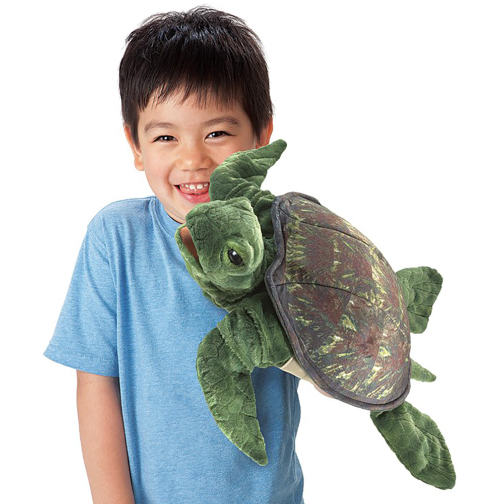 Immerse yourself in timeless ocean adventures with the Folkmanis® Sea Turtle Hand Puppet! This ancient sea dweller features a stunningly detailed shell, textured scaly fabric, and a plush suede underbelly that's wonderfully soft to the touch. With expressive, wise eyes and a movable mouth, she tells stories from the depths of history, while her front flippers elegantly glide through imaginary waters right into your heart. Winner of multiple honors including the 2014 Parents' Choice Silver Honor, 2014 Dr. Toy Best Picks and 2014 TDmonthly Top Toy Award. She's the perfect companion for journeys filled with wonder and wisdom. Are you ready to dive deep beneath the waves on a magical adventure?